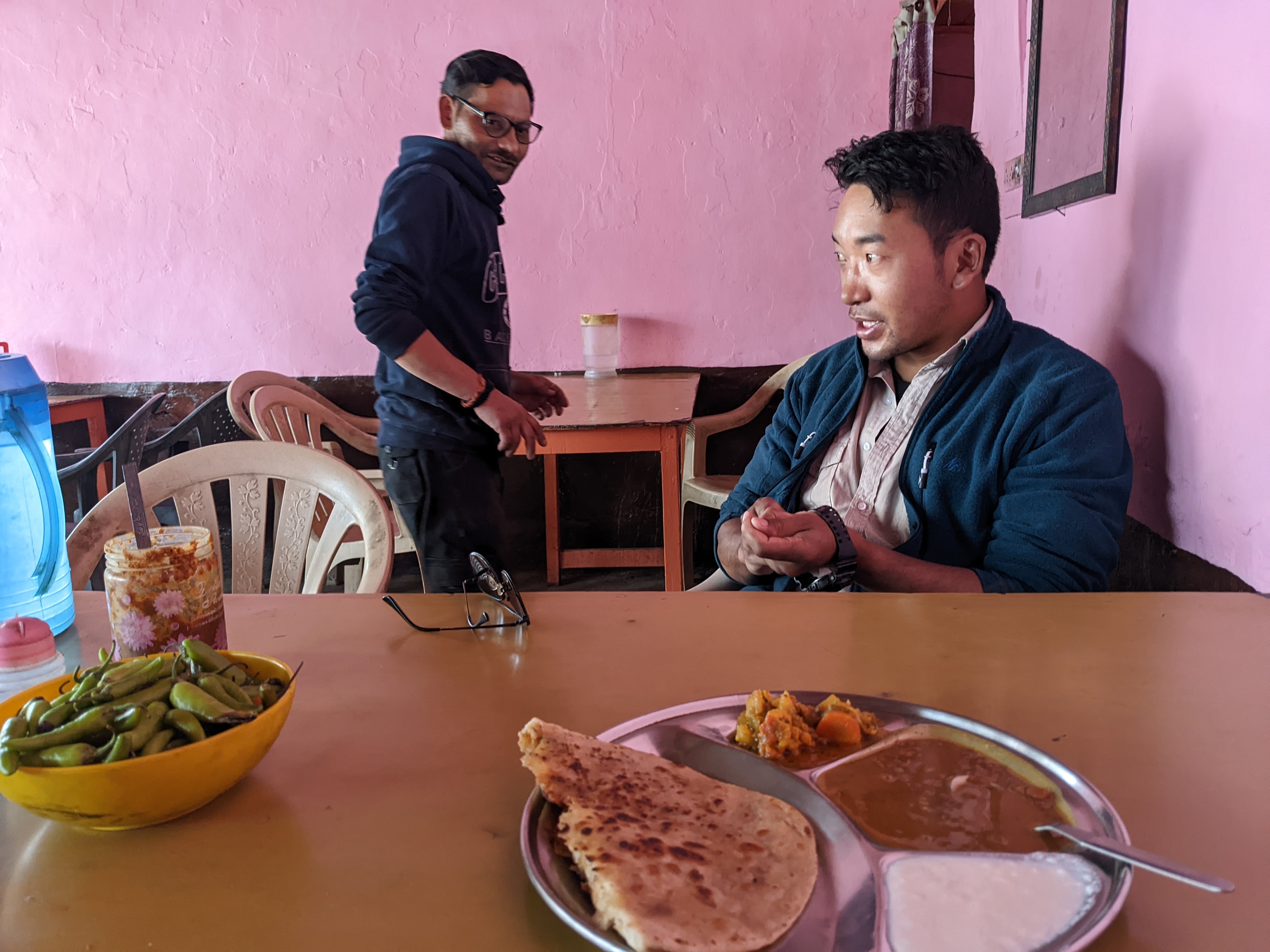 At 1:45 PM we stopped at Kharu for a quick Paratha. Dawa had asked if I would be interested in eating at a local place where he usually stopped. He was a bit nervous that I might find it too simple, but I told him I was happy to try. For the two of us, it was only 160 INR (2.05 USD) and also very tasty!