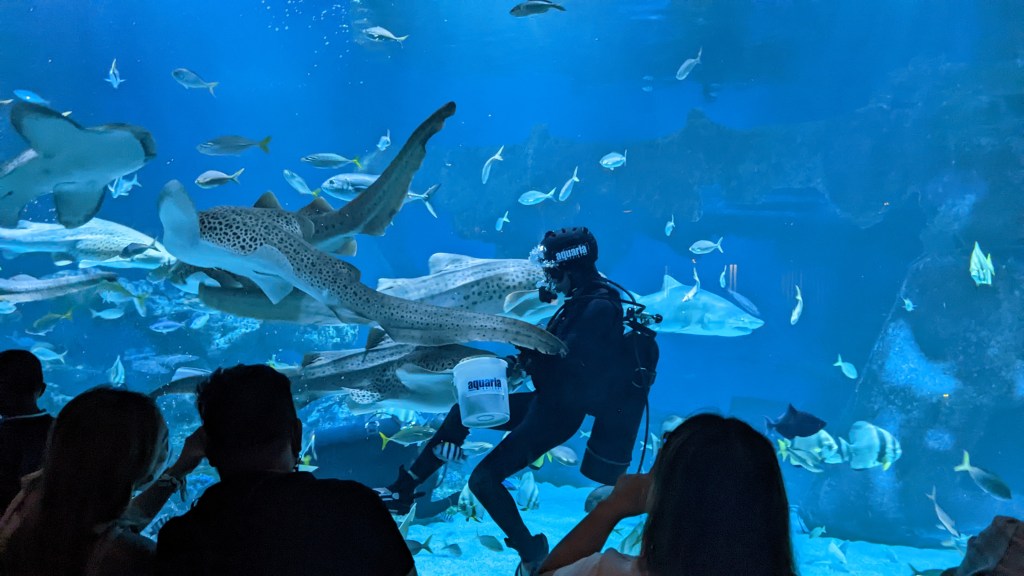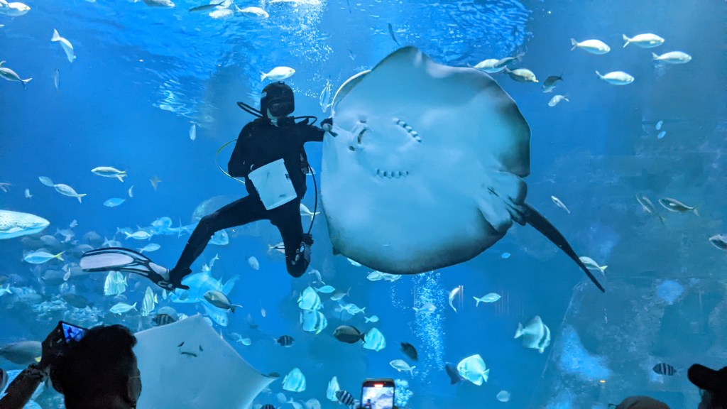 Then at 3:30 PM was the “feeding show.” In this case there wasn’t any music, but it still was rather interesting since for obvious reasons. The fish flocked around the diver, guaranteeing much better views, in particular some of the large manta rays. This went on for perhaps a full thirty minutes.