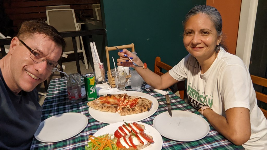We then headed back towards Elisabet’s area for dinner, arriving at around 7:45 PM, this time eating at a tasty pizza and pasta place called Da Moreno Pizzería and Italian Restaurant; it’s definitely a place worth visiting if you are in the Koh Kaew area. A tasty, ample meal (truth be told it was probably too much food) for two was 750 THB (19.80 USD).
