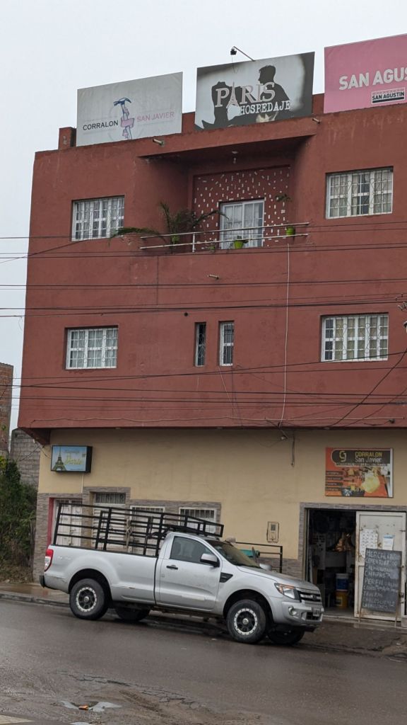 At 9:16 AM Julio indicated we were about to make a stop and he suggested that if we planned on buying drinks or snacks we do it then, since the future stop would be “touristic” and we wouldn’t want to waste time. He also said that after this we would steadily be gaining altitude. As announced, at 9:21 we had a 15 minute gas station stop. I think we were in San Salvador de Jujuy in San Pedrito neighborhood. Lots of people were getting food, but I had eaten beforehand so thought I would be fine waiting until lunch. At 9:35 AM the advert sign for Paris lodging left little to the imagination as to the intended clientele. Then at 9:39 PM I was waiting again back in the bus. It was rather overcast and quite cool (10 C), but Julio seemed to think the sky would be more clear where we were going.