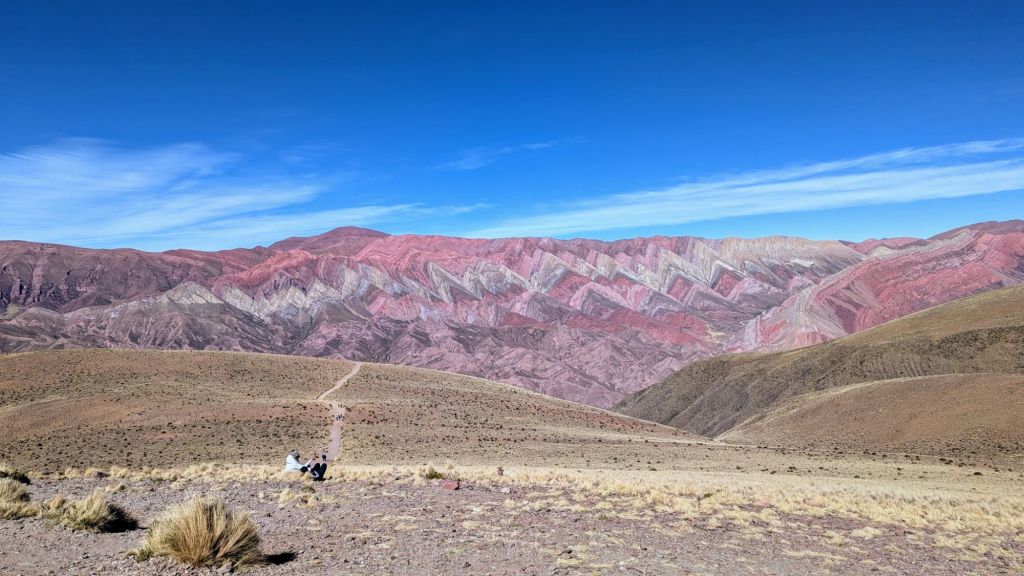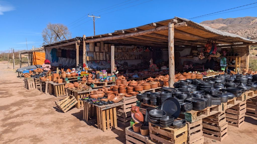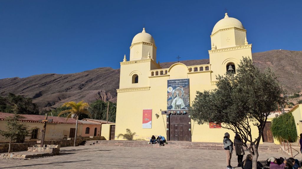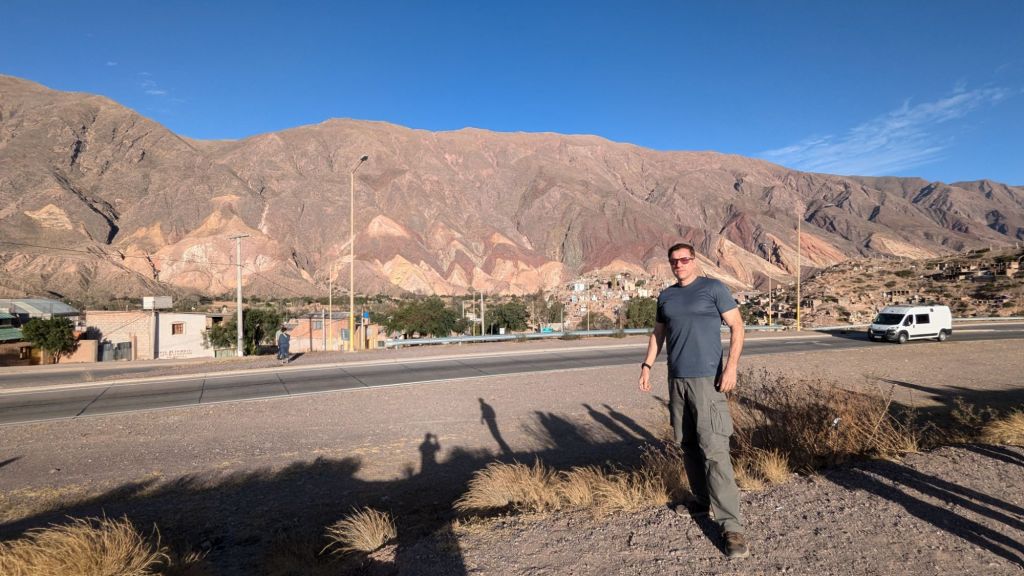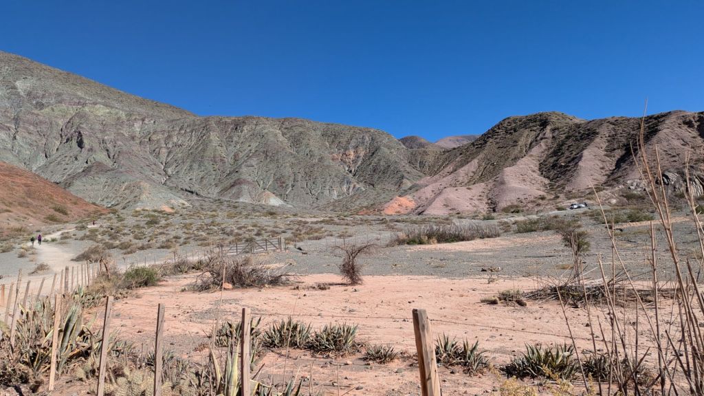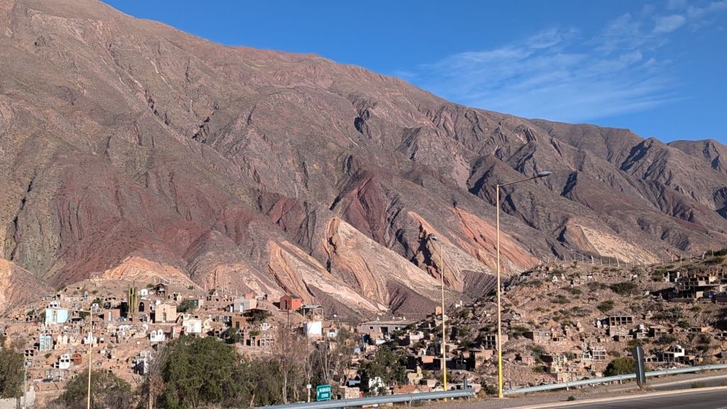 At 10:50 AM I had sort of fallen into a half asleep state the last hour, so when I opened my eyes, we were just then arriving at Purmanarca and yes, it is now completely sunny here. It’s a picturesque village, and I understand why people like to stay here overnight. I was a bit sorry to have missed the gradual change of scenery and climate, but it was a beautiful thing to open my eyes to after the dreary overcast weather in Salta.