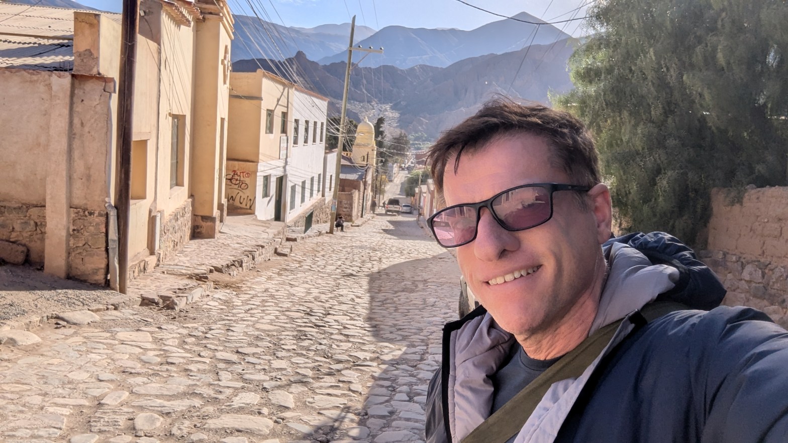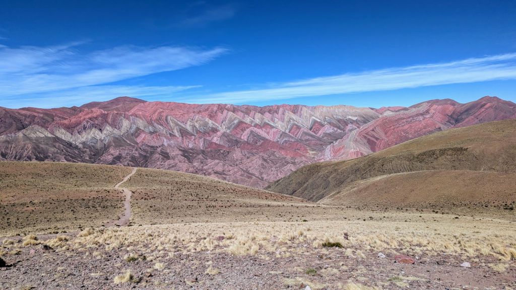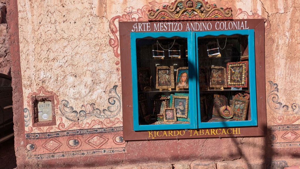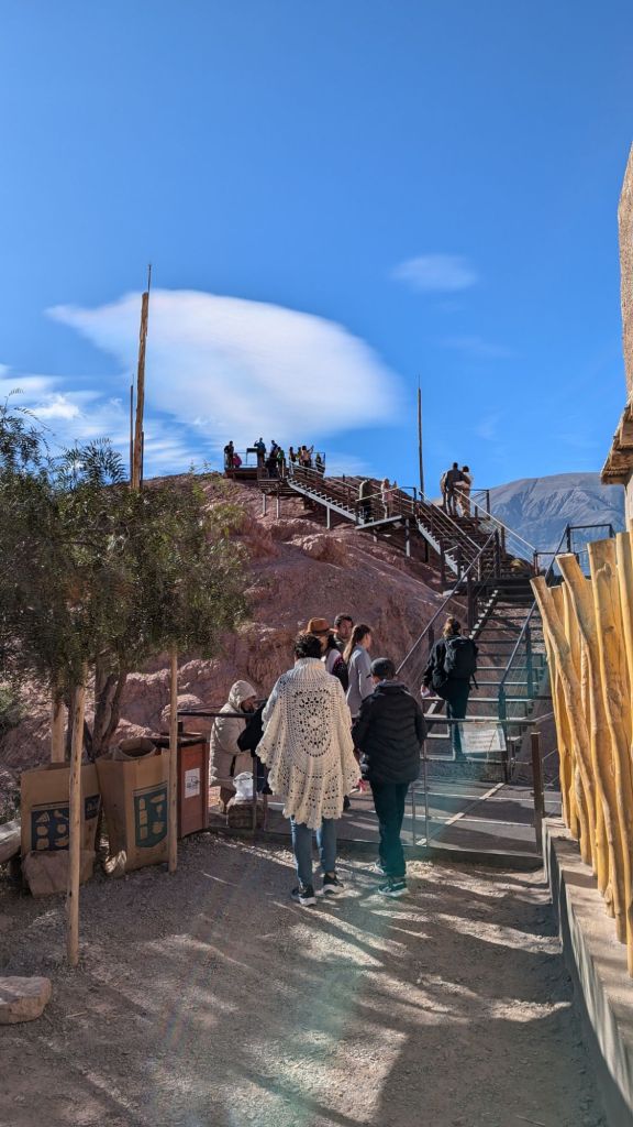 At 10:50 AM I had sort of fallen into a half asleep state the last hour, so when I opened my eyes, we were just then arriving at Purmanarca and yes, it is now completely sunny here. It’s a picturesque village, and I understand why people like to stay here overnight. I was a bit sorry to have missed the gradual change of scenery and climate, but it was a beautiful thing to open my eyes to after the dreary overcast weather in Salta.