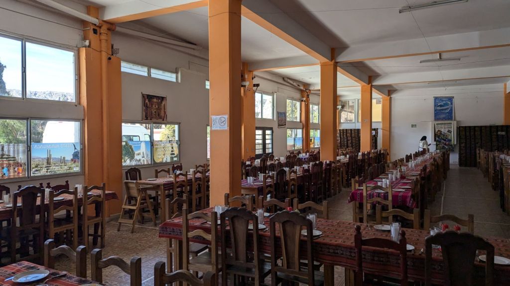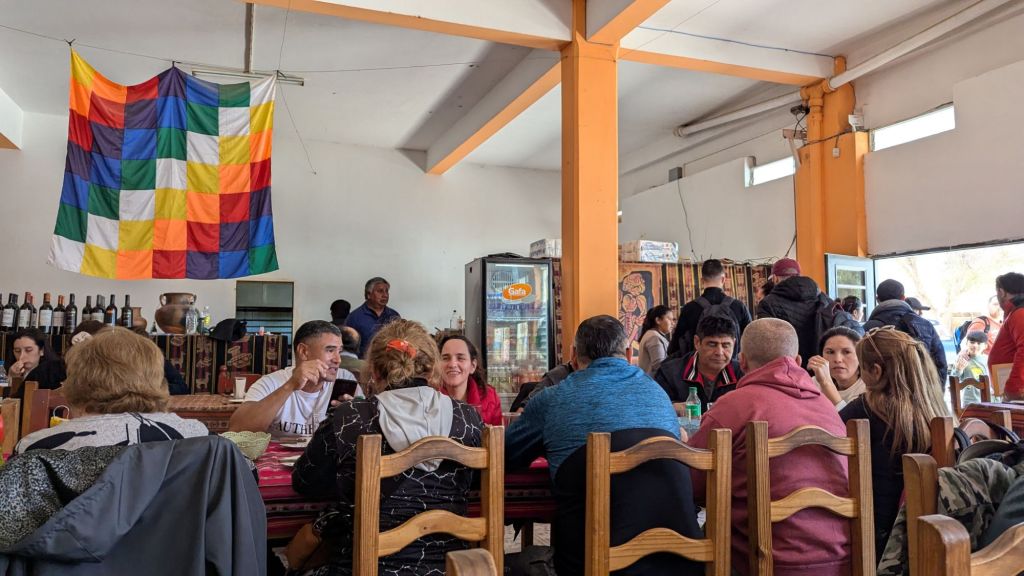At 12:37 PM we arrived at Humahuaca, and at 12:42 PM we got off the bus and into the restaurant. The flag which is hanging is the flag of the pueblos originarios, which now has a similar status to the national flag which is blue and white. That’s why both of them were raised on flag day. I paid 9000 ARS ($7.26 USD) cash for my take away lunch and then at 12:51 PM was picked up by the next transport to Hornocal. Cachete is the guide and with this group we go to Hornocal.