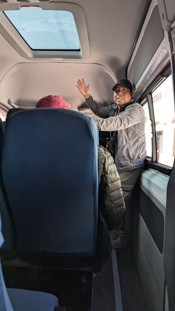 At 7:24 AM I was still waiting, and I noticed there were a couple of people waiting outside the main door of the apartment. Then a message came at 7:26 AM indicating that my driver was about to arrive, so I went out, and sure enough the van pulled up almost immediately. There were already several people (maybe seven) inside. However, those waiting outside my lodging were not among them; perhaps they were waiting for another tour operator? Anyway, I found my seat and at 7:29 AM we were off.