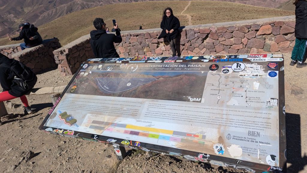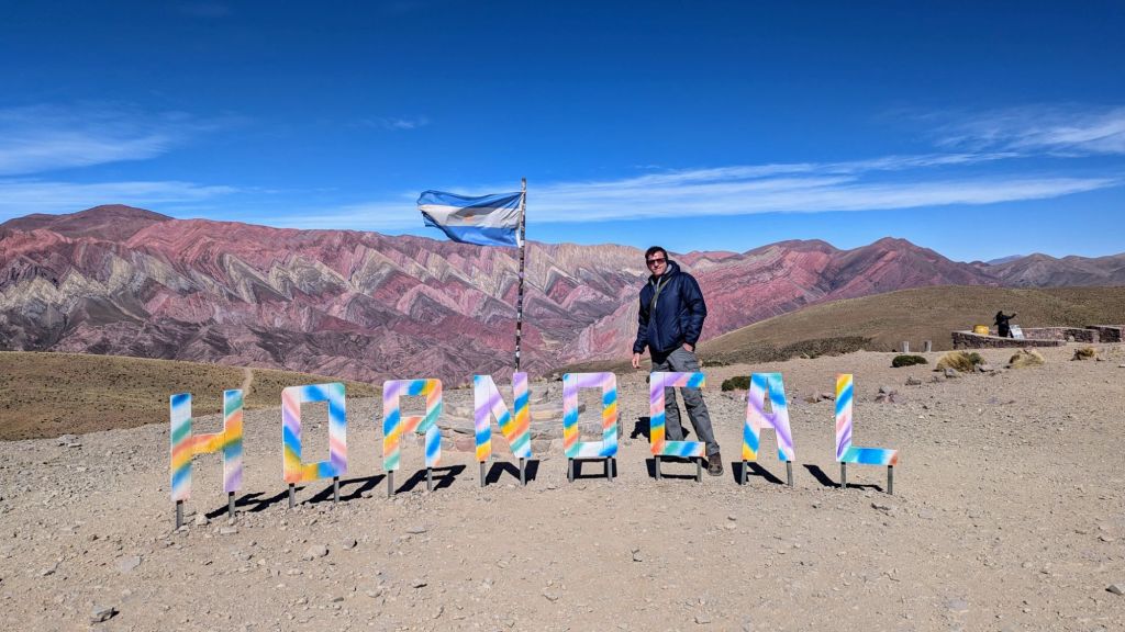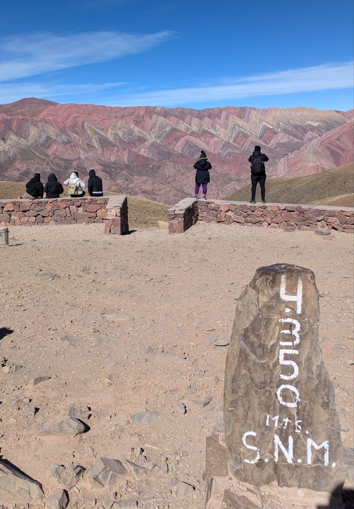 Finally at 1:53 PM we arrived. We were told to be back in the transport at 2:20 PM. So anyways, this was the famous 14 color hill. Yes, it was impressive, but I understand why a lot of people stayed back in the town. At 2:10 PM everyone was taking turns helping take pictures of each other next to the Hornocal sign. Despite being at 4350 meters above sea level, I fortunately didn’t feel any altitude sickness. That might have been because of the coco candy and the liquid, or maybe I just wasn’t affected. At any rate, I was happy to not feel sick. It was quite windy.