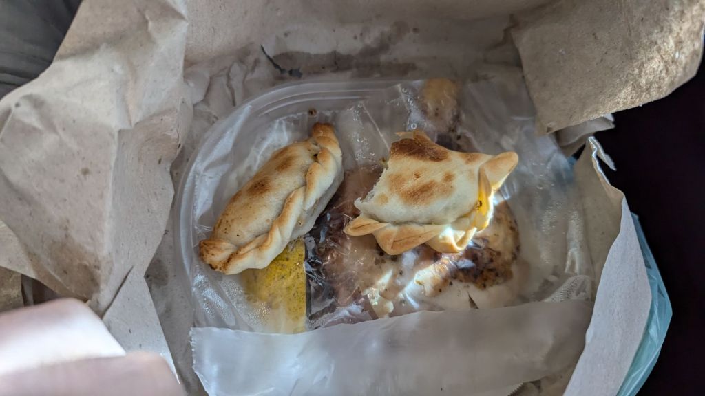 Once we were under easy, I, like the others who had gone up to Hornocal, ate my lunch on the bus, finishing it at 4:13 PM. The roasted chicken, 2 small empanadas, rice and a badly bruised apple were not delicious, but they were perfectly adequate. The beef empanada was notably better than the chicken one.