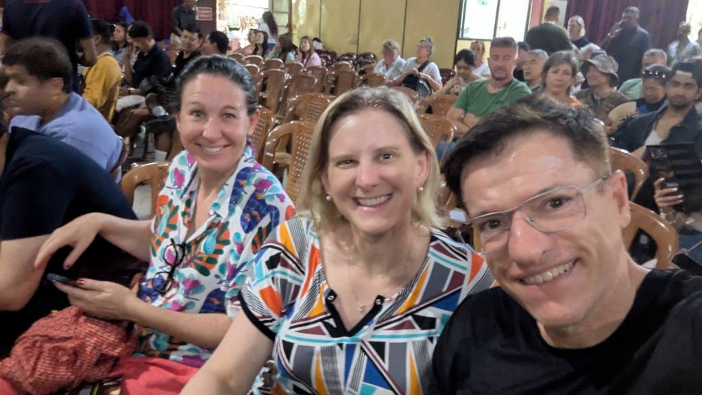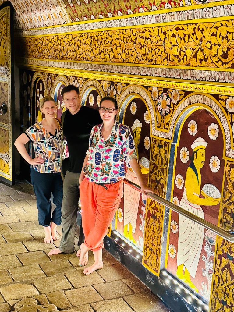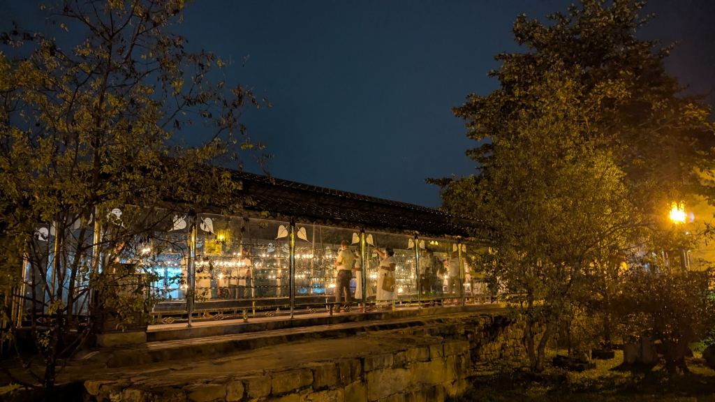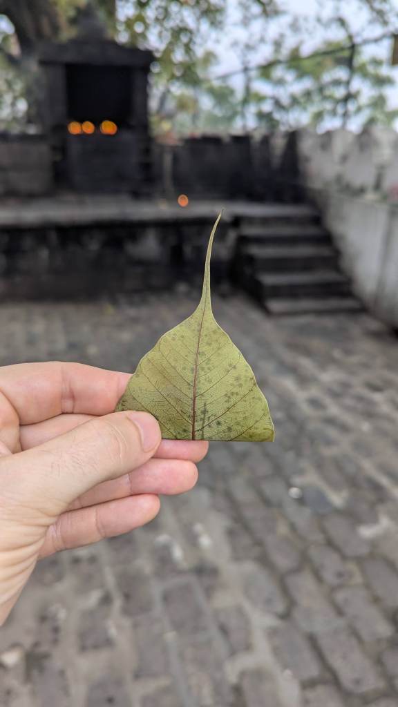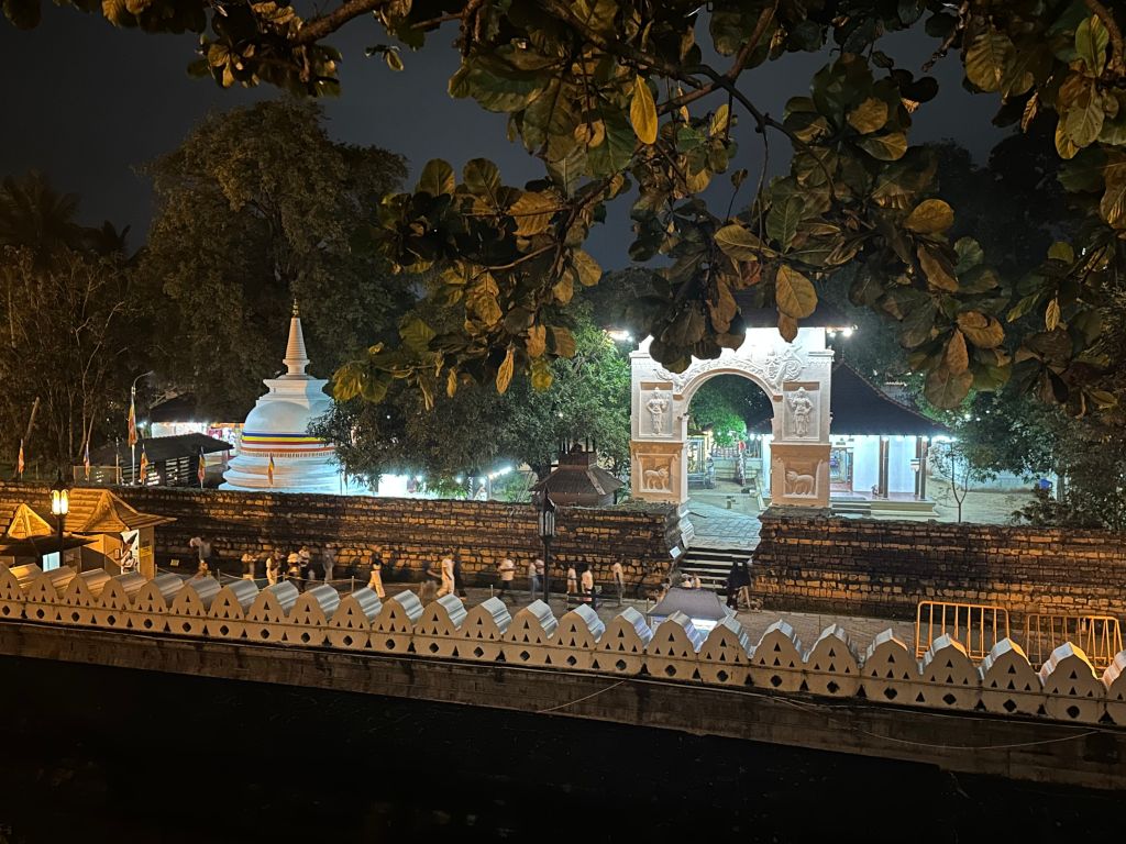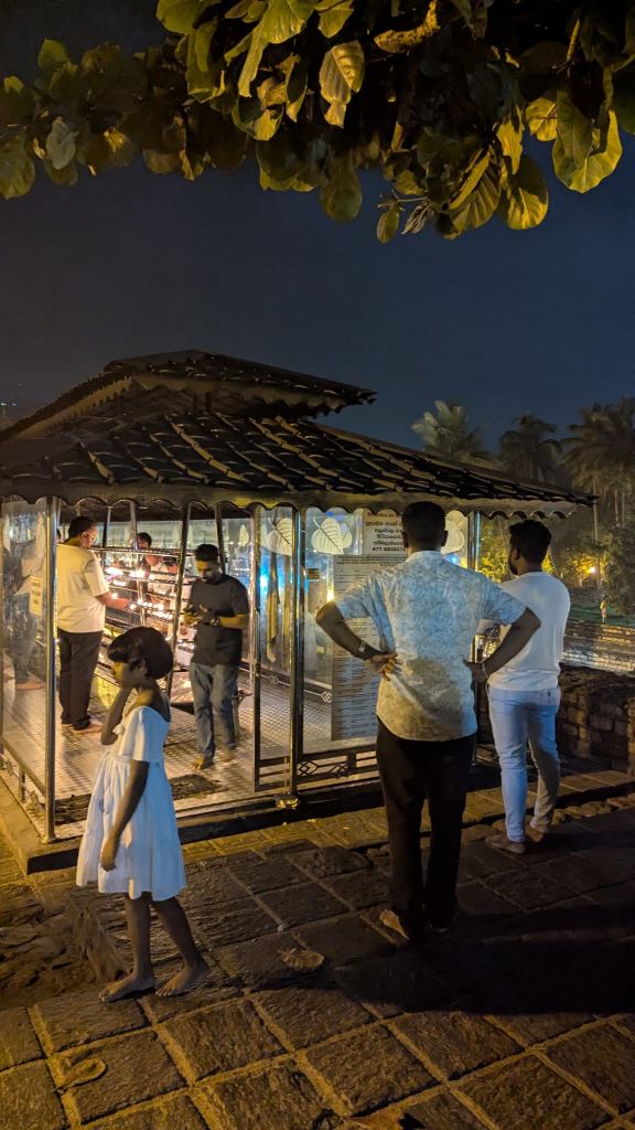 At 6:58 PM we were outside for a few moments. And I was glad of that. We saw the preserved body of Raja the Tusker and then I stayed outside while Dorothee and Laurianne lit some oil lanterns in a glass enclosed space. Honestly, I was just happy to have a break from so many people and so much noise from the inside of the temple.