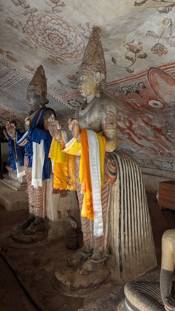 Okay, so here are some other tidbits. The place where we were visiting was called the Dambulla cave temple. Like every other historic religious site around here, basically everything has some symbolic meaning which I of course did not understand. The first reclining Buddha seen when one enters from the stairs is from about 2000 years ago, with each area afterwards being a bit newer. Then right about as the drum started at 9:57 AM to indicate that we had to start leaving, I learned my favorite fun fact for the day. The dome shape of the Buddhist stupas is based on the shape of the Bo tree leaf, and how it looks when it is folded in half. These, trees, under which it is said that the Buddha meditated, are considered holy throughout all of Sri Lanka.