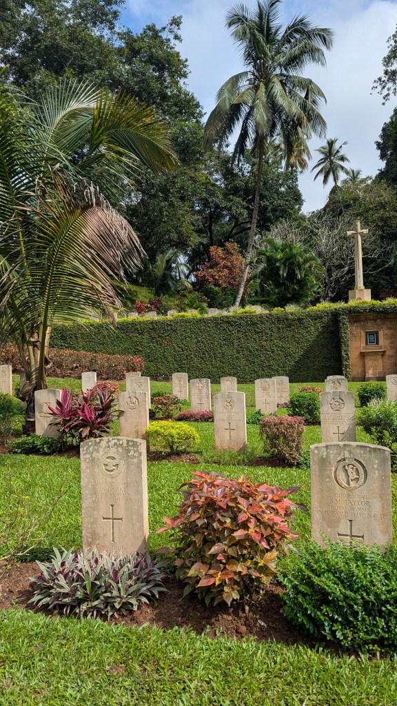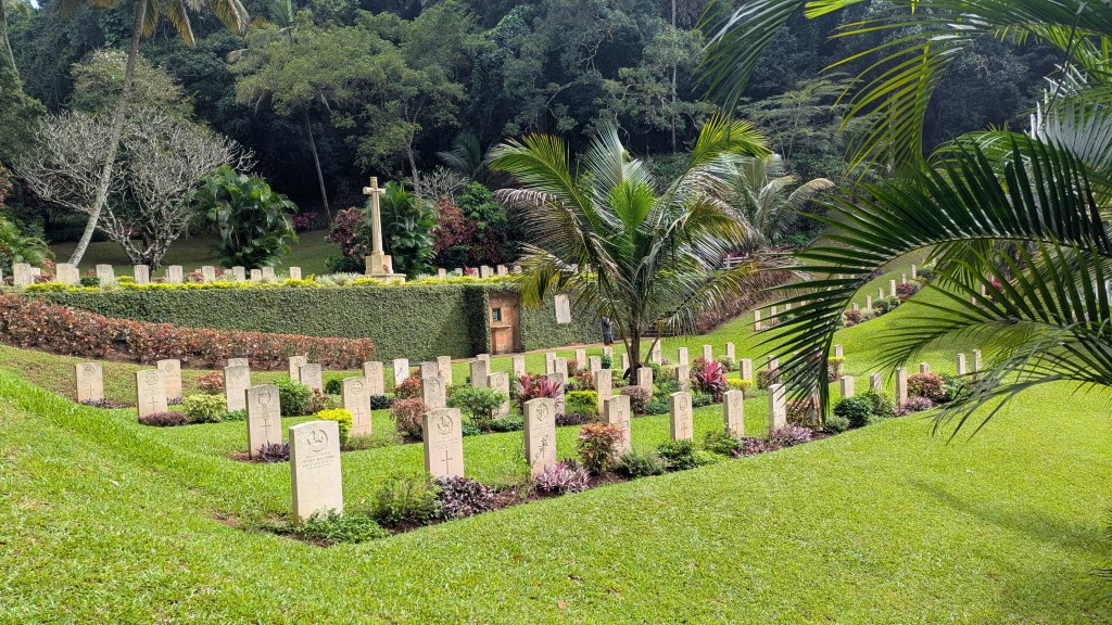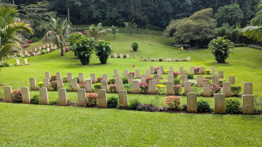 The road to Kandy had a lot of twists and turns, and I was starting to get a bit nauseous, so when Dorothee expressed interest in getting out and looking around a bit at the Kandy War Cemetary from WWII at 2:01 PM, I was good with getting out to at least not be in the vehicle for a few minutes. I was very impressed with how well the cemetery was maintained. It was also interesting, because I had never really thought about Sri Lanka having been involved in the second world war.