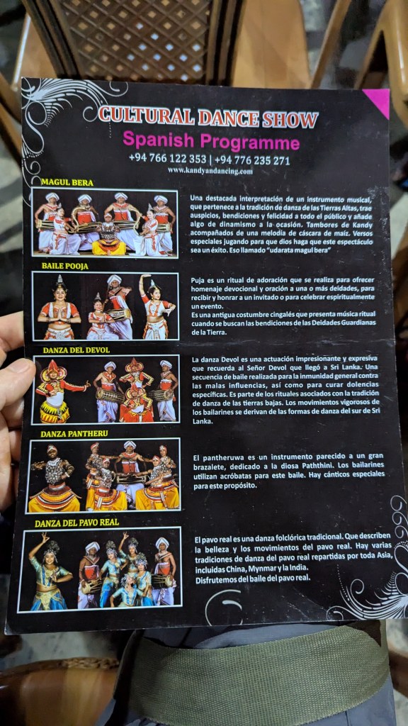 When we met back up with Erik at 4:30 PM, he told us that Kandy has approximately 35,000 lakes, and 99% of them are manmade, including the main one we had seen there in Kandy. At 4:43 PM we were at the folkloric dance place, where we had to pay 2000 LKR ($6.82 USD) each.