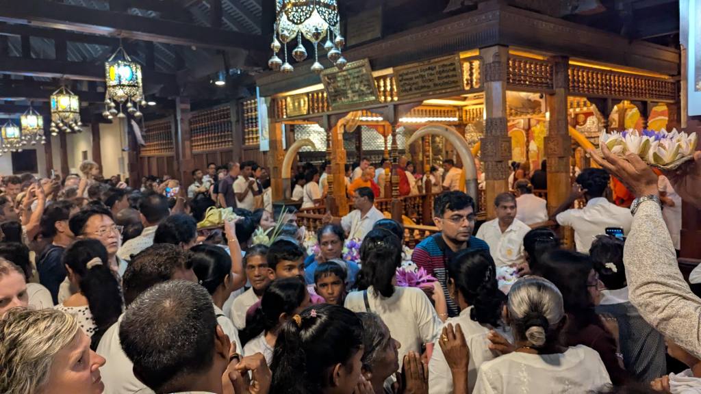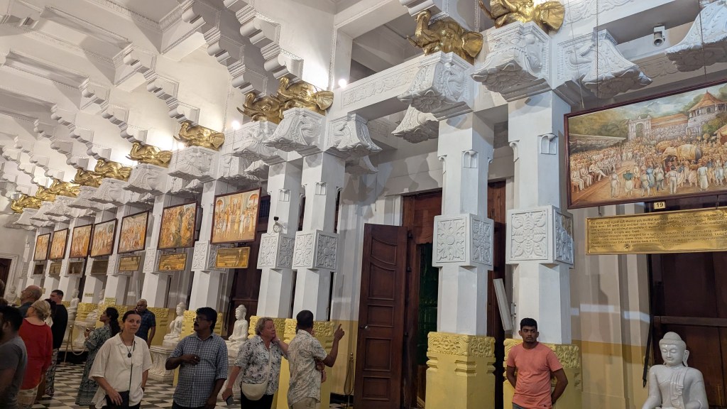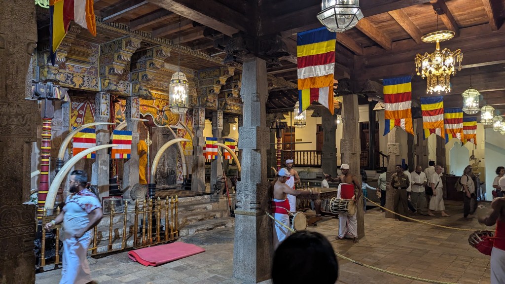 We had to rush from the dance place to the nearby Buddha tooth temple where we arrived at 6:15 PM and each paid 2000 LKR ($6.82 USD) to enter. Of course, this was another no shoes place. We went all over the place in there, and at times I was a bit anxious with the press of people. Special thanks to Laurianne, as she could tell that I was freaking out a bit about it and took some extra pains to calm me down and also prevent too many people from constantly pushing me from all sides. The first thing that struck me as I entered was that these people were definitely not shy about displaying elephant tusks, at least not in a religious setting. There was some sort of a religious ceremony going on related to the tooth of the Buddha relic which supposedly is located here.