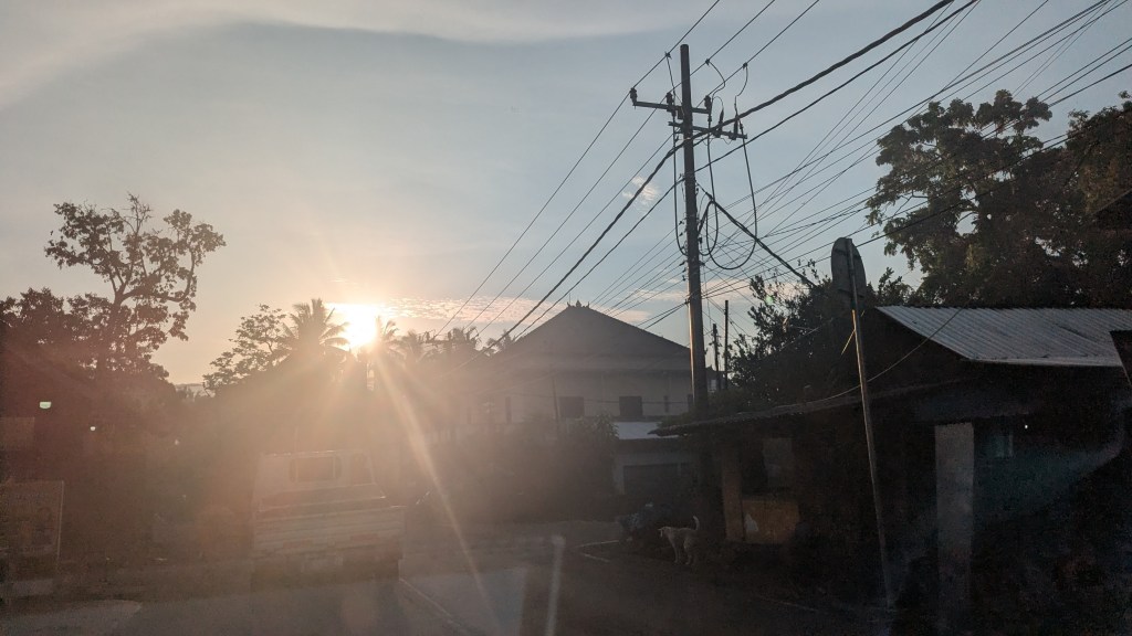 Unsurprisingly at this time of the morning, there didn’t seem to be any traffic. Furthermore, the vehicle was comfortable, and the roads were in good condition. At 5:00 AM, we stopped briefly at a convenience store, where I bought two chicken dumplings and a soy drink for 123 INR ($1.38 USD). Moving on from there, at 5:30 AM, the sun was starting to come up, and even in the quickly moving vehicle, the sky over the distant mountains was beautiful.