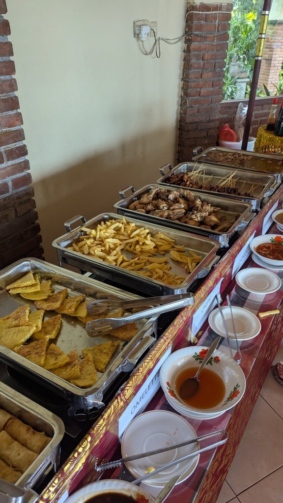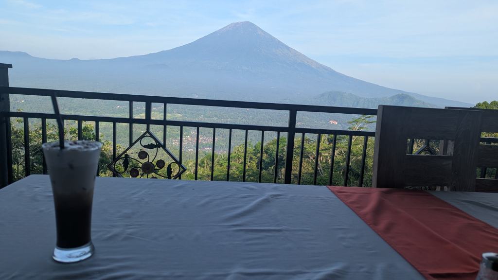 We arrived to Lereng Agung Restaurant at 2:31 PM. There, I was initially delighted to see this large bat on a perch near the entrance. My buffet lunch here was included in the tour, and I took full advantage of the same. The food wasn’t particularly amazing, but I had no particular complaints. Furthermore, the view was outstanding.
