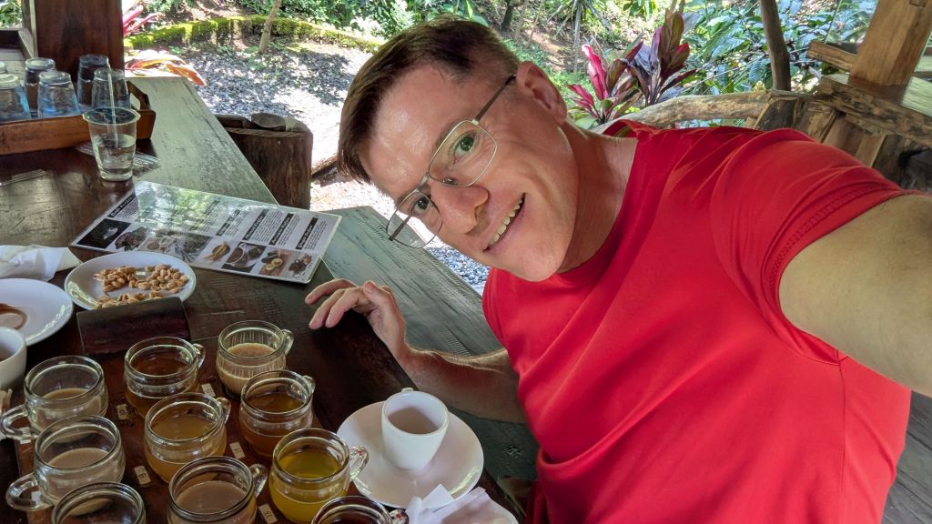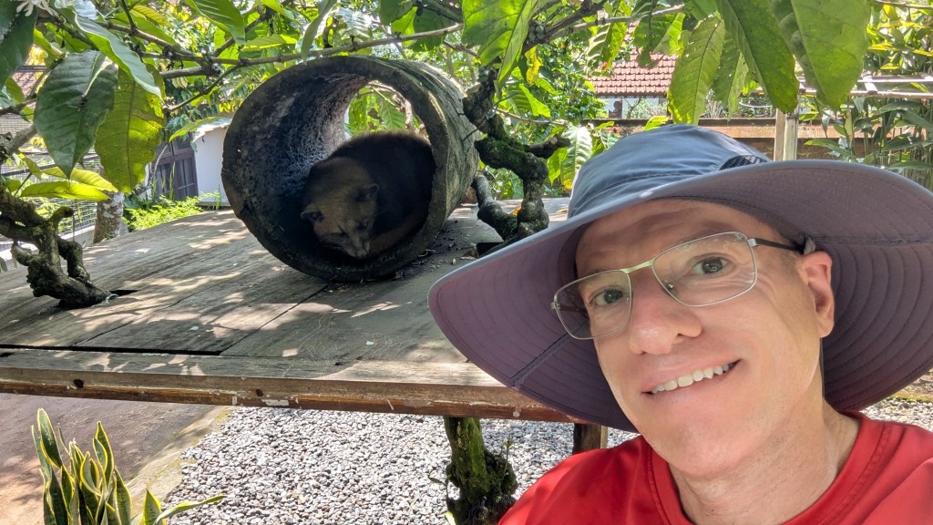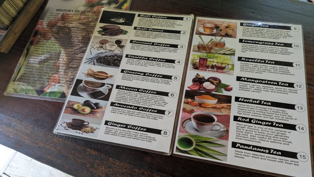Our next stop at 10:28 AM was Tunas Bali Luwak Coffee where we had a coffee tasting tour with the on-site guide Nyoman. Obviously, the hope here was that we would buy things, but I didn´t. However, I did enjoy the “free” selection of teas and coffees, and felt that Nyoman did a good job. So, when the tour ended at 11:23 AM I left a tip of 15000 IDR ($0.90 USD), and I think that Karla also bought a couple of bags of coffee.