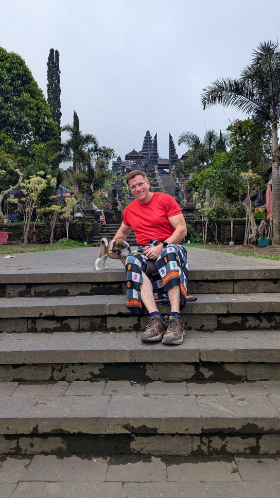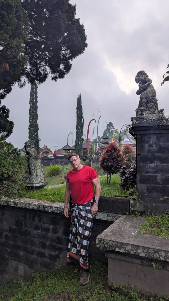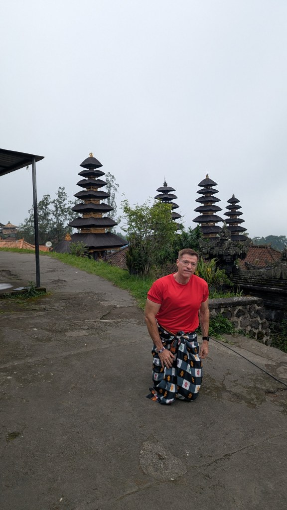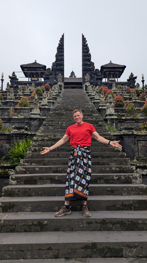 At 6:40 AM we arrived to the Lempuyang area and almost immediately got in a bus which took up up a rather twisty road to another stopping point. Here, as frequently happens in Bali, we had “required sarongs” tied on us. This had happened to me a few days ago as well. Not to be disrespectful, but the whole thing seemed a bit silly. Still, when in Bali . . .